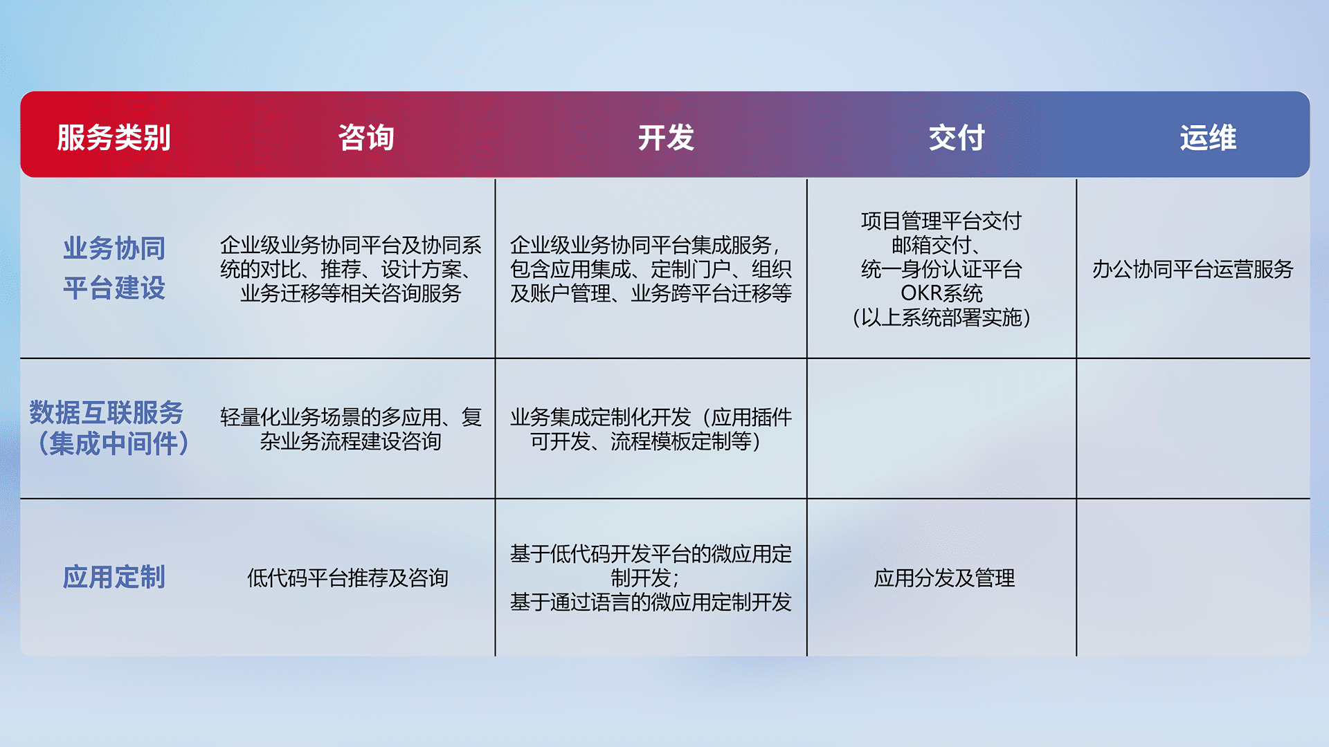 针对钉钉、、、企微、、、、IDaas等平台级产品提供产品的规划、、、方案、、交付、、定制化开发等服务,,,,实现如统一协同办公、、、、智能客户服务、、混合会议管理、、、、智能数据查询、、、等业务场景,,实现数字化转型。。。。
